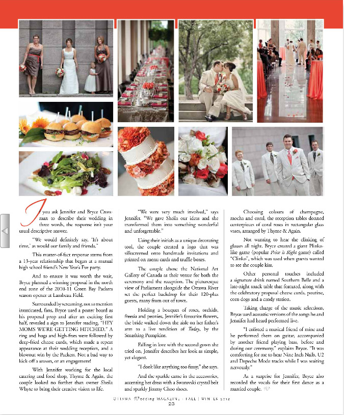 I was happy to hear today that one of my weddings from last year was featured on the latest edition of Ottawa Wedding Magazine. Have a look on pages 22-23. Sweet!
